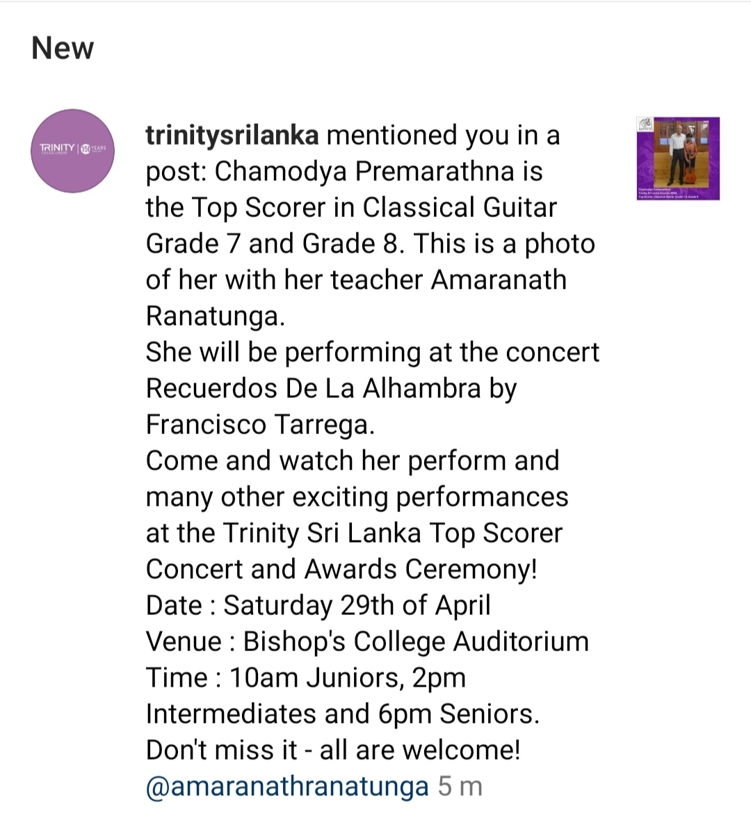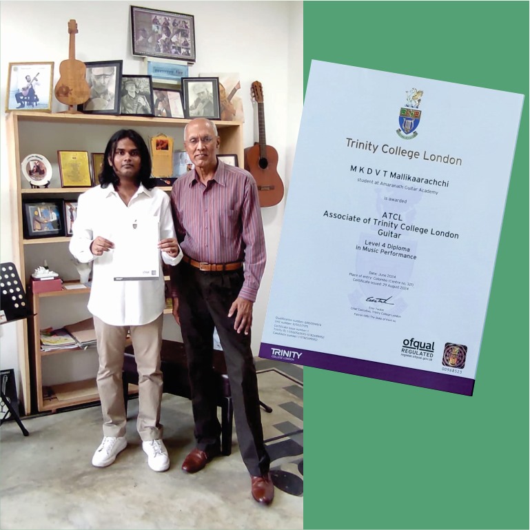 A student of Amaranath Guitar Academy, Vishwaka Thejan with the Certificate. Associate of Trinity College London. (ATCL) Guitar.