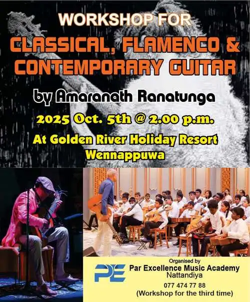 Workshop for Classical, Flamenco and Contemporary Guitar at Golden River Holiday Resort, Wennappuwa on the 5th Oct. 2025 at 2.00 p.m. Organised by Par Excellence Music Academy, Natandiya, Sri Lanka.